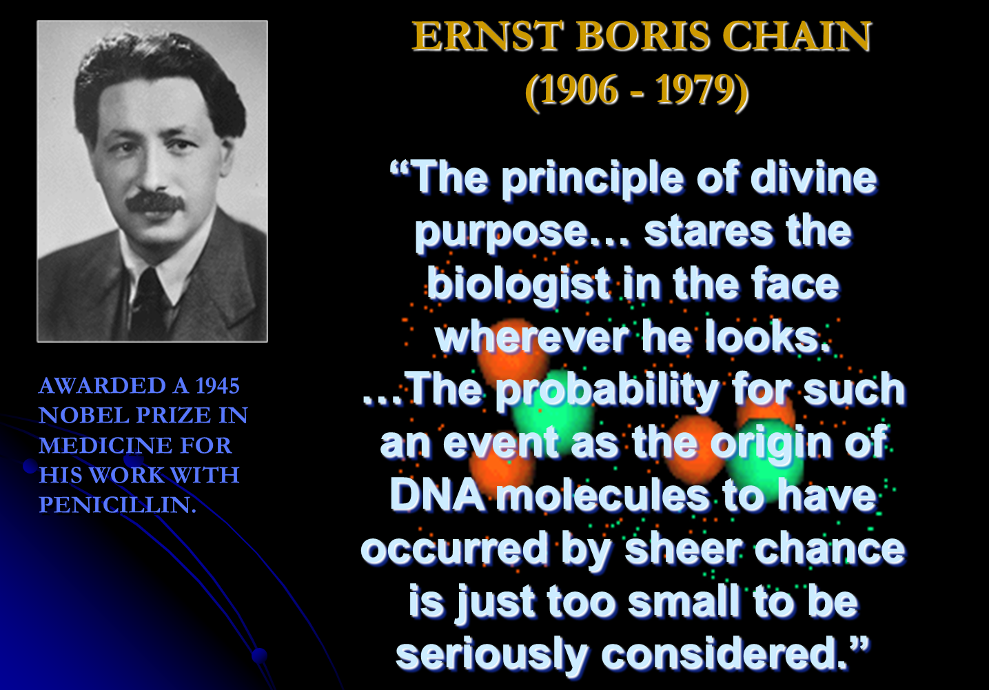 Sir Ernst Boris Chain a German-born British biochemist, and a believing Jew, rejected the origin of information in the DNA by random chance evolution.