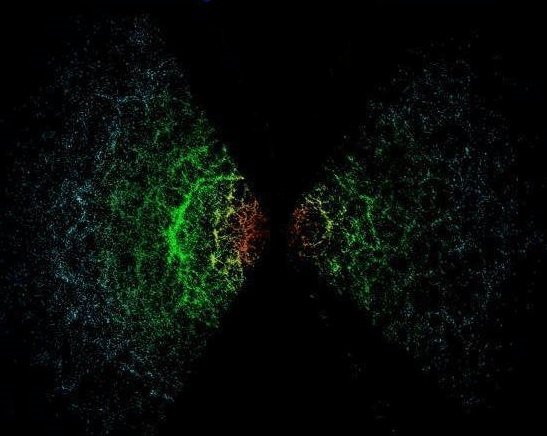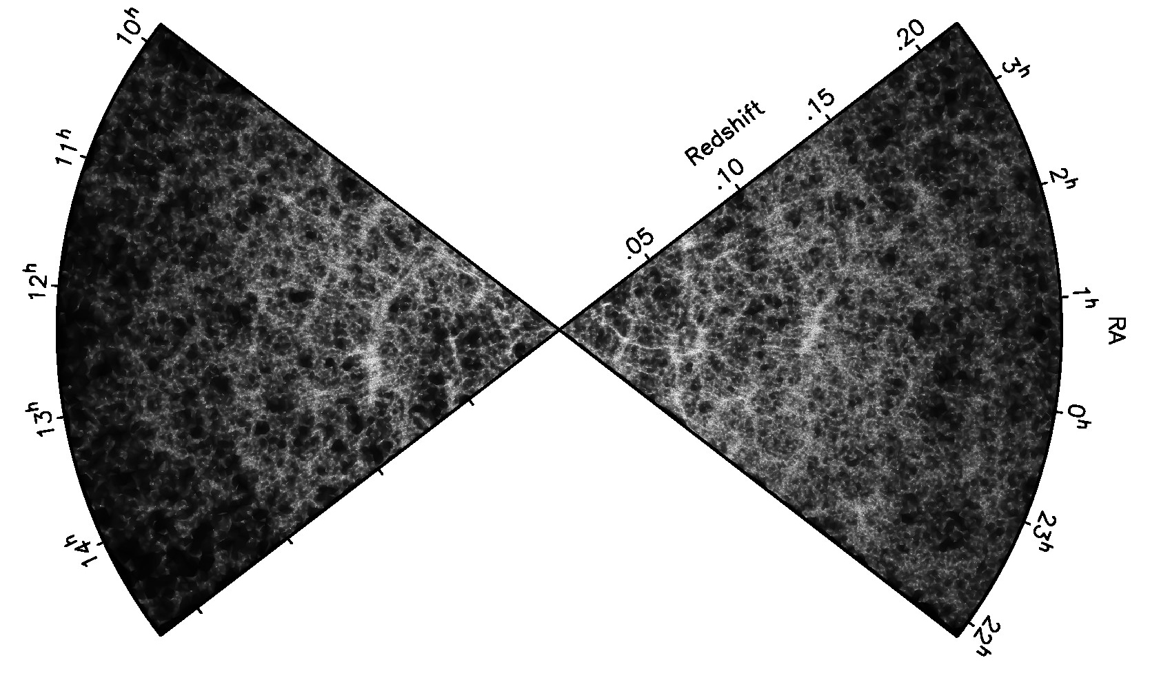 Another, the Sloan Digital Sky Survey (SDSS),2 in 2003 announced the first measurements of galactic structures more than a billion light-years across and mapped about two hundred thousand galaxies in 6% of the sky. Later this was extended to more than one million galaxies. A portion of these galaxies is shown projected onto a plane, in Fig. 2 (at the top of this post).