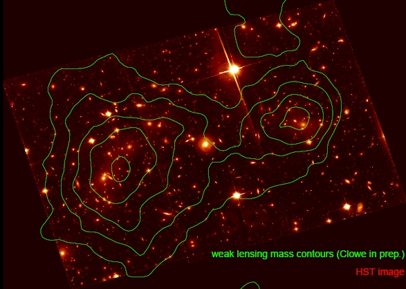 In Fig. 3 we see the claimed mass density contour lines which were determined totally from gravitational lensing. It was claimed that the spatial offset of the center of the total mass from the center of the visible normal mass (matter that emits light) was evidence that dark matter is real. Though this interpretation of the gravitational lensing results is disputed.