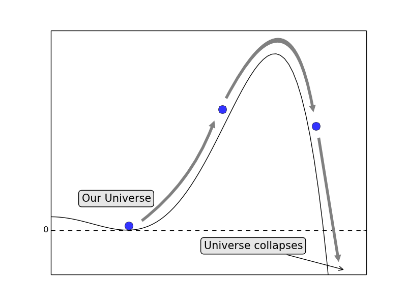 As mentioned above, from BICEP2 data this necessarily must be a large-field model, and is inherently unstable. It follows from this approach then that the universe would have been subject to large quantum fluctuations during the cosmic inflation phase, ‘kicking’ it over the energy barrier into the other valley of the Higgs field, within a fraction of a second. Consequently the universe should have quickly collapsed in a big crunch. That means it should have disappeared back into the singularity from whence it supposedly came. Hogan says,