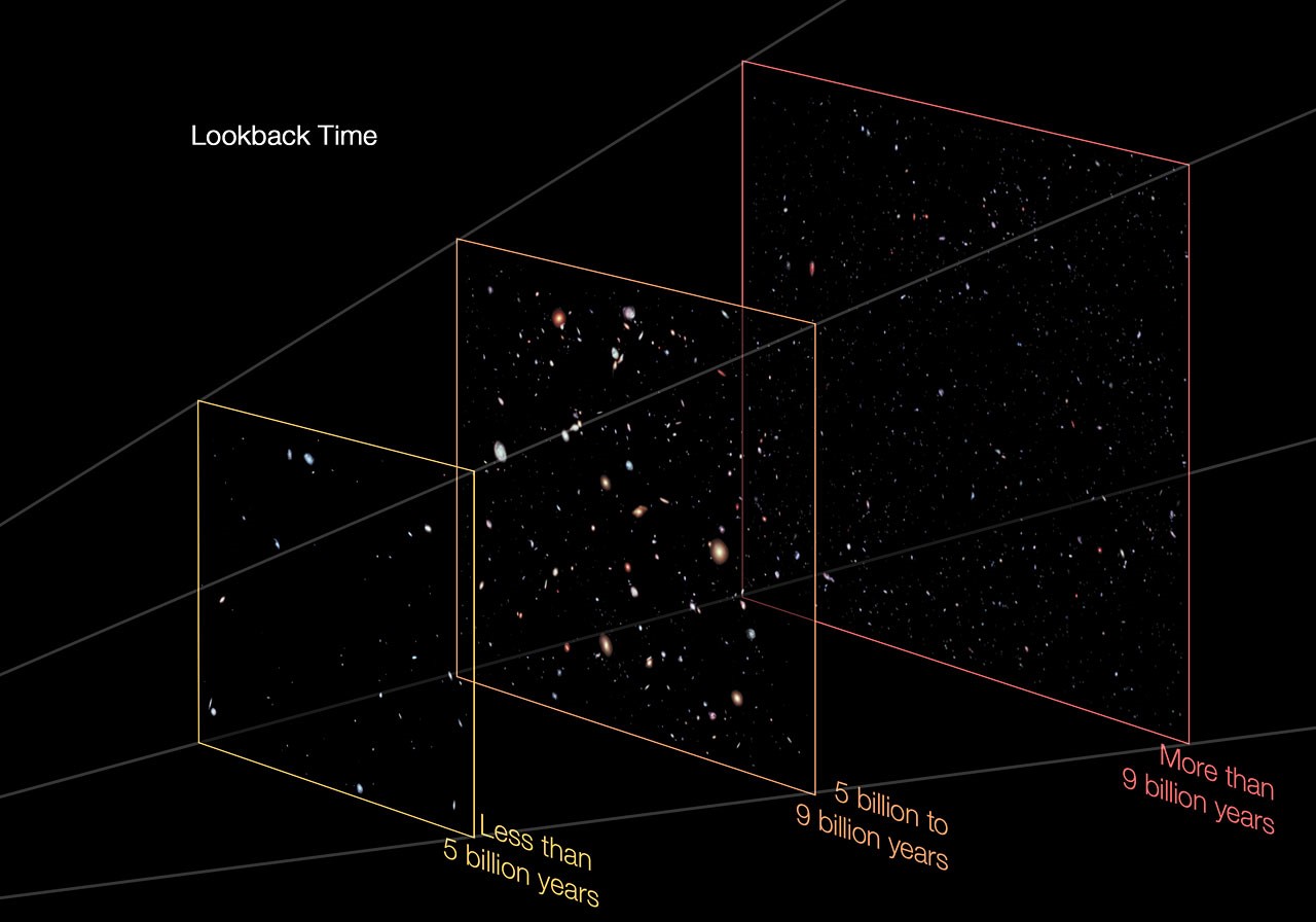 This is illustrated in Fig. 2, assembled from 10 years of observational data from the Hubble Space Telescope, called the Hubble eXtreme Deep Field (XDF). There you see an increase in density from the more distant hence ‘more than 9 billion years’ frame to the middle frame labelled ‘5 billion to 9 billion years’ and then a decrease in density towards the closest or more recent frame labelled ‘less than 5 billion years’.
