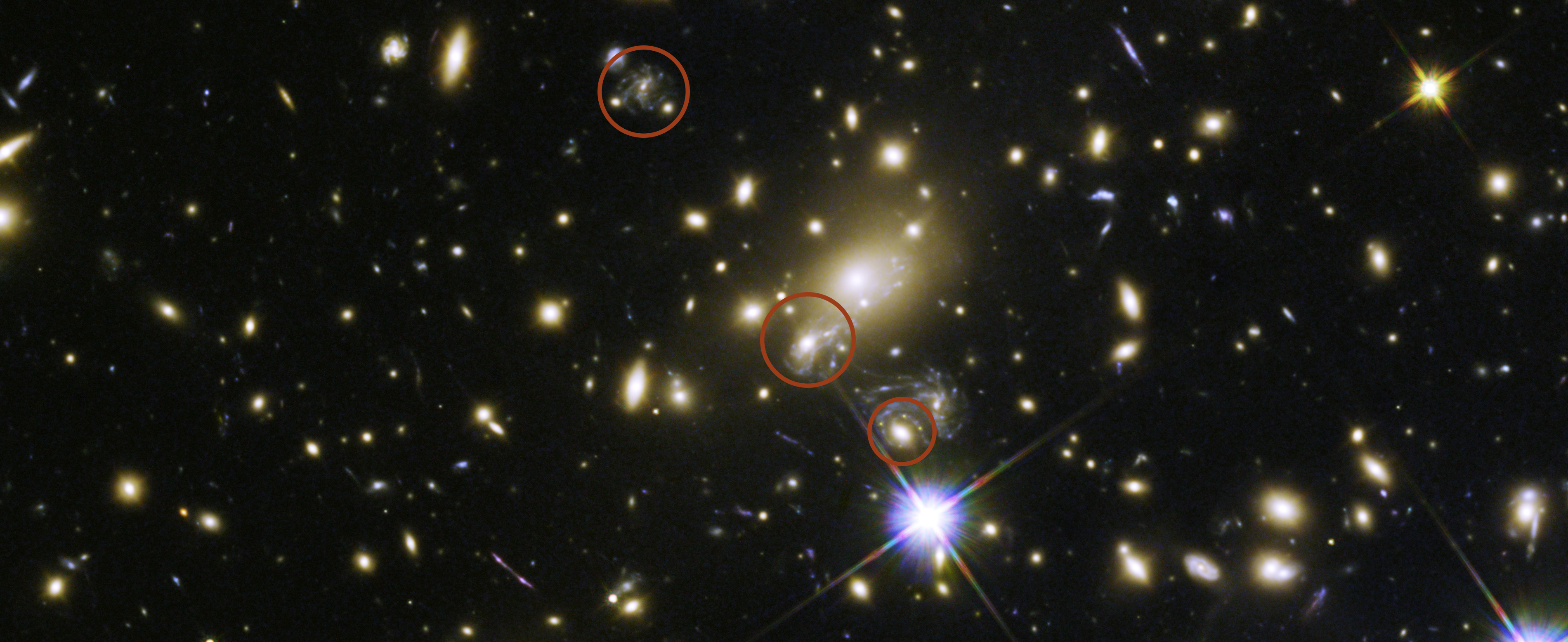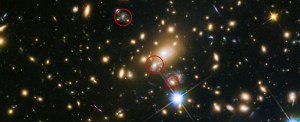 This image shows the huge galaxy cluster MACS J1149.5+223, whose light took over 5 billion years to reach us. The huge mass of the cluster and one of the galaxies within it is bending the light from a supernova behind them and creating four separate images of the supernova, shown clearly in this annotated image.…