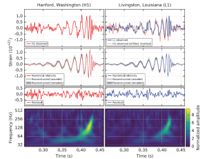 Figure 1: The gravitational-wave event GW150914 observed by the LIGO Hanford (H1, left column panels) and Livingston (L1, right column panels) detectors. Times are shown relative to 14 September 2015 at 09:50:45 UTC. For visualization, all time series are filtered with a 35–350 Hz bandpass filter to suppress large fluctuations outside the detectors’ most sensitive…