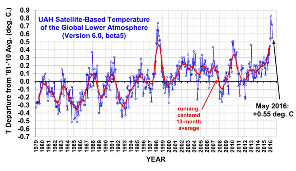 - Roy Spencer, Latest global average tropospheric temperatures, accessed July 1, 2016.