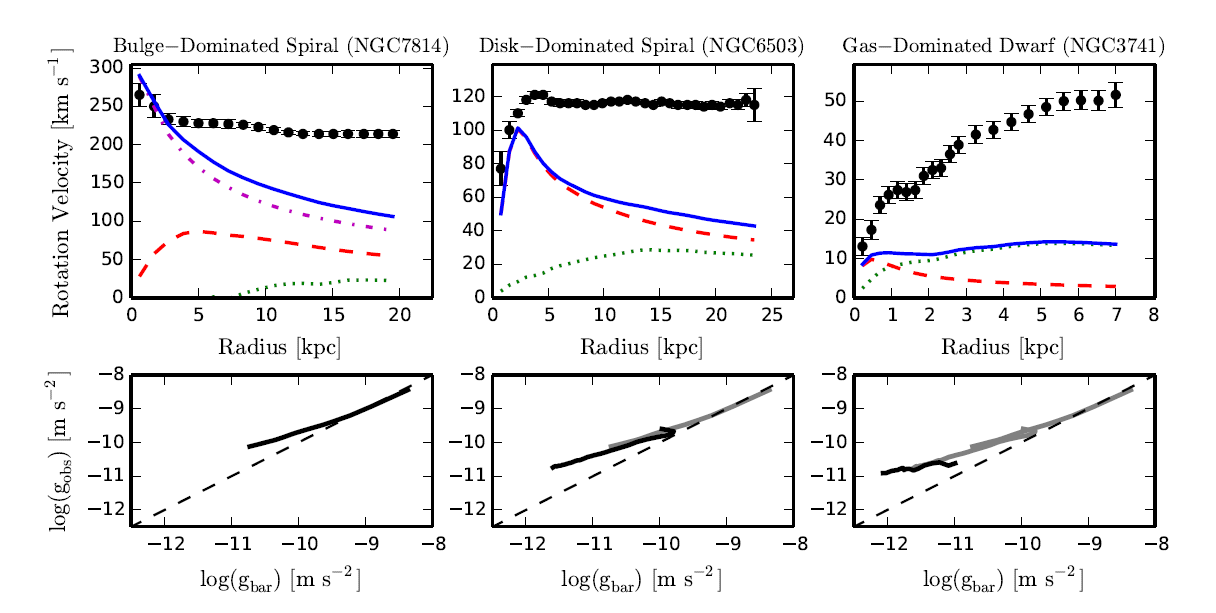 Assuming standard Newtonian (or Keplerian) physics the acceleration due to the baryonic matter, gbar, is all we should need to correctly calculate the rotation curve of any galaxy. See Fig. 2 (which reproduces their Fig. 2). Some representative rotation curves are shown by the upper-most black circles with error bars. Quite obviously the solid blue lines—the expect rotation velocities due to the observed baryonic matter—do not follow the observed rotation curves, but fall well below, in most galaxies. This is the reason halo dark matter is invoked. See Fig. 1.
