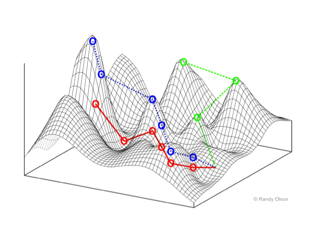 But also remember the claim is that evolution is undirected; a mindless shuffling of the code to find a more fit organism. He introduces the notion of the multidimensional fitness landscape (one dimension for each gene, for about 25,000 in humans) where evolution finds the gene most successful to survive, meaning reproduce, in the random shuffling through the landscape. See Fig. 2 (but for only 2 dimensions).