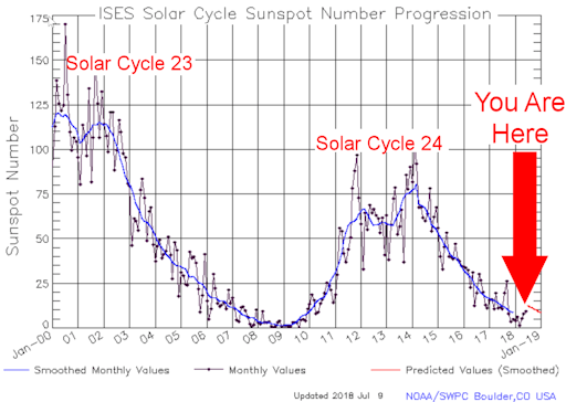 The 11-year sunspot cycle number 24 has just ended. We are entering sunspot cycle 25. The number of sunspots has been decreasing over the past 3 cycles which has been about 4 decades. See plot below.
