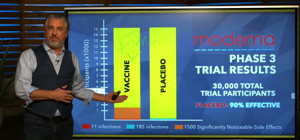 As it turns out the scientists did not look for any COVID19 symptoms until 14 days after the second injection, or 42 days after the first injection. The vaccine requires two shots 28 days apart. So all the initial symptoms that many experienced after getting their shots were ignored and only those who developed symptoms 14 days after the second shot were considered.
