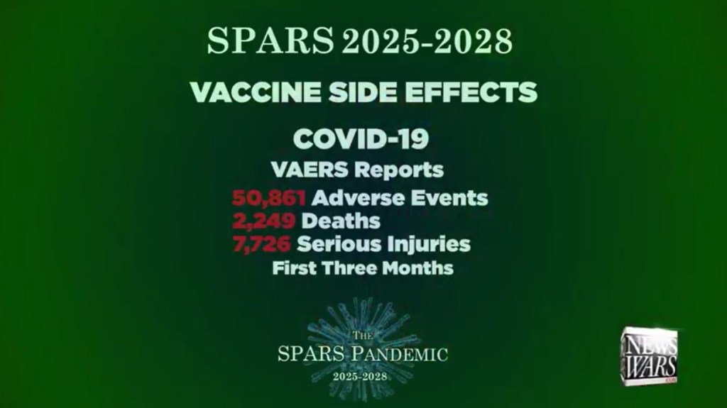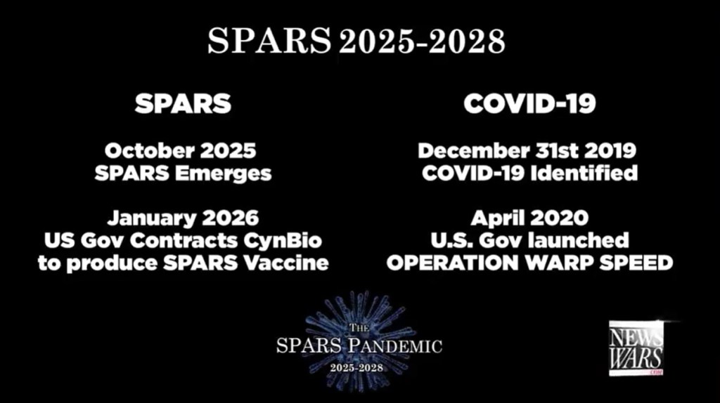 The parallels between the SPARS 2025-2028 Plandemic drill and the current COVID-19 Plandemic is truly remarkable when you drill down into the details. Watch this Alex Jones InfoWars.com broadcast.