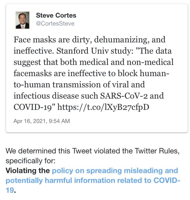 Instead, a DuckDuckGo search reveals it was picked up by ZERO mainstream media outlets and Big Tech tyrants will suspend people who post it, as political strategist Steve Cortes learned the hard way when he posted a Tweet that went against the face mask narrative. The Tweet itself featured a quote and a link that prompted Twitter to suspend his account, potentially indefinitely.