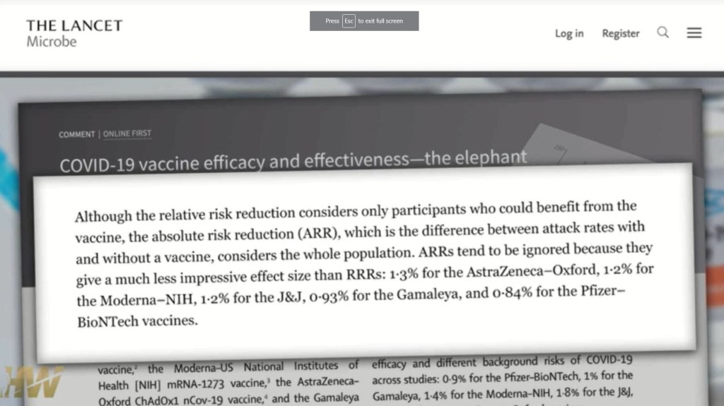 We have been told by the vaccine manufacturers like Pfizer and Morderna that their COVID injections are 95% efficacious but that is only a relative risk reduction (RRR). It only compares those in the vaccine arm of the trial with those in the placebo group who got COVID during the trial. But the absolute rick reduction (ARR) is the risk we get when compared to the whole population because not everyone gets the disease anyway. When you factor this in the efficacy is massively reduced to somewhere between 1.3% and 0.84%. See graphic below. What a con? Why take a vaccine for such a small reduction in risk from a disease that most recover from anyway?
