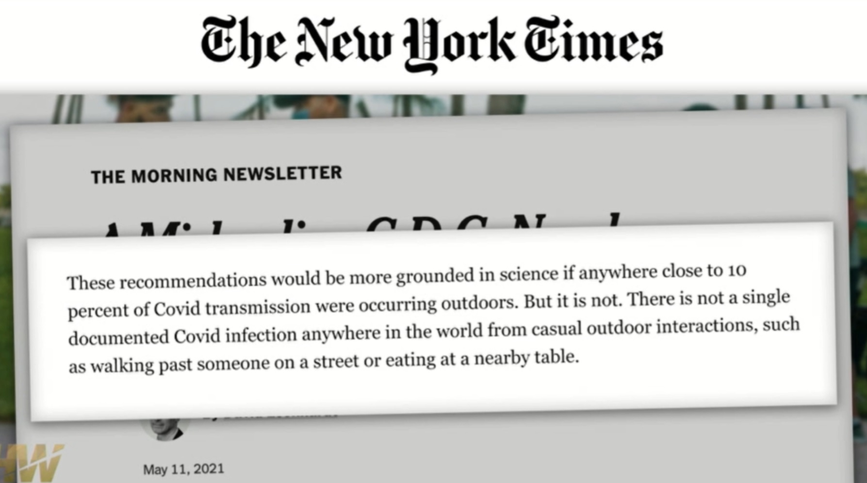 The CDC claims that 10% of all COVID transmission occurs outdoors but real science from published papers indicates that it is as low as 0.1% or less. In fact there is not a single documented case of an infection from a casual outdoor interaction anywhere in the world.