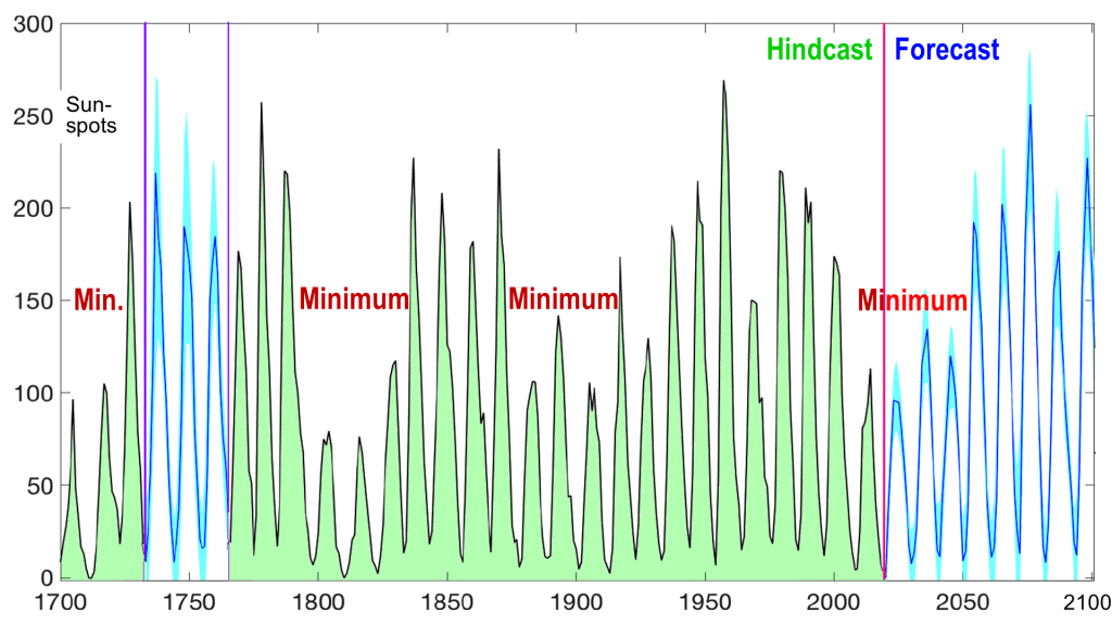 The three scientists taught a machine-learning algorithm how to recognize underlying patterns and cycles in the past 320 years’ sunspot record. The algorithm then discovered a hitherto-unnoticed interaction between the 5.5-year solar half-cycles (blue) and the 120-year Gleissberg double cycles (red dotted lines) which allowed it to confirm the earlier predictions of a quiet half-century to come – predictions which are now shared by solar physicists. See graph below.