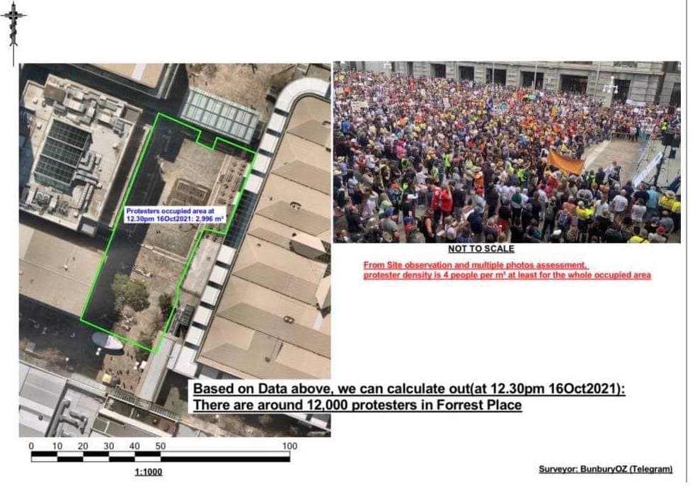 Based on the above calculation there were about 12,000 people protesting at the Freedom Rally on Saturday in Perth. The AUSTRALIANS UNITE AGAINST TYRANNY RALLY was organised by the West Australian Peacemakers.