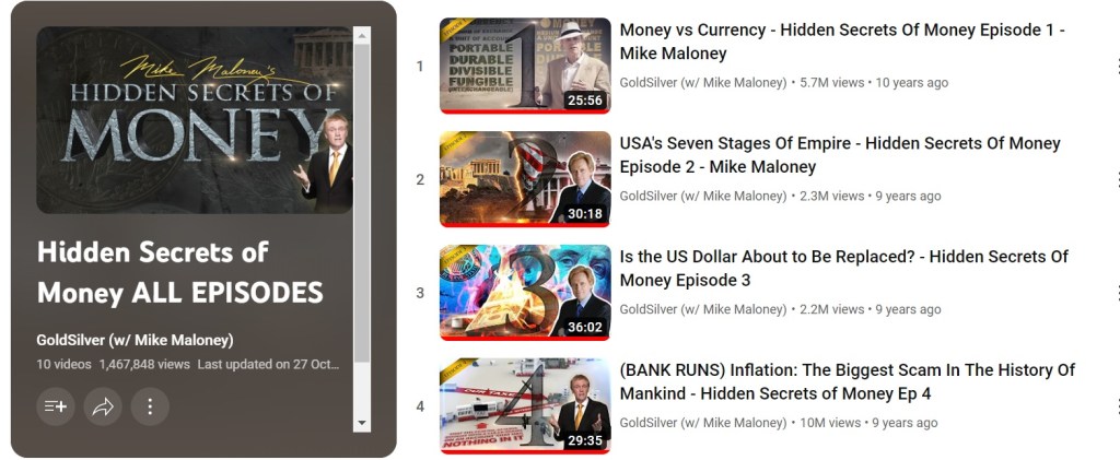 Here is a very important series of videos you should watch: Mike Maloney’s “Hidden Secrets of Money” (10 Episodes). This is the link to access the whole series on YouTube: https://www.youtube.com/playlist?list=PLE88E9ICdiphYjJkeeLL2O09eJoC8r7Dc