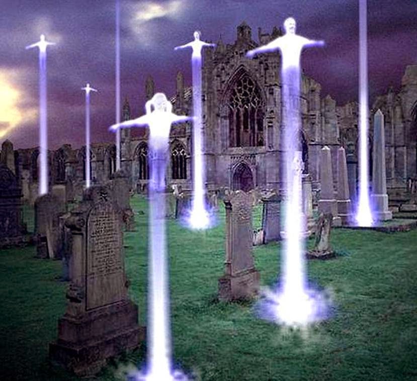 51 And behold, the veil of the temple was rent [torn] in two from the top to the bottom; and the earth did quake [earthquake] and the rocks rent [split]. 52 And the graves were opened; and many bodies of the saints [believers] which slept [ie. were dead] arose, 53 and came out of the graves after His resurrection and went into the holy city and appeared to many.