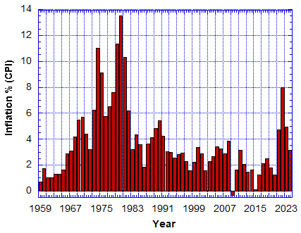 My modelling shows you that $1 in 1959 deflates in value and by January 1, 2024, it would take nearly $47 to buy the same commodity that in 1959 only cost $1. A US $1 one oz silver coin for example should cost USD $47 today.