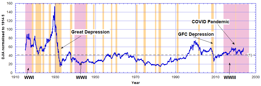 The GFC depression is particularly obvious on this chart. Ten years before was a period of very cheap money, which boosted the Dow until it crashed in 2008 right through its mean value. But even that period was an illusion which vanished as the reality of the sub-prime mortgage backed securities became real. The GFC saw the Dow drop from 56 to 28 as priced in 1914 dollars, which is a 2x drop compared to 10x during the Great Depression.