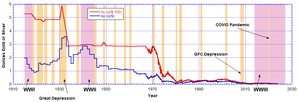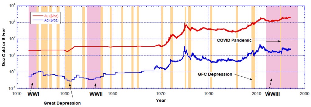 Silver was demonetized on February 12, 1873 when it was no longer exchangeable for dollars. During recessions the price of silver falls, especially noticeable during the Great Depression, but it rose during world wars. We are now in the beginning stages of World War III (from 2014 US overthrow of the government in Ukraine) so we should expect the silver price to rise again soon.
