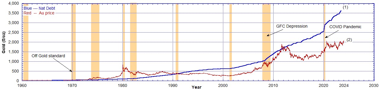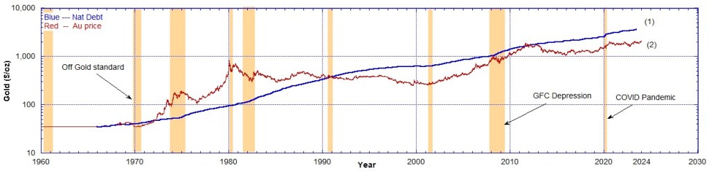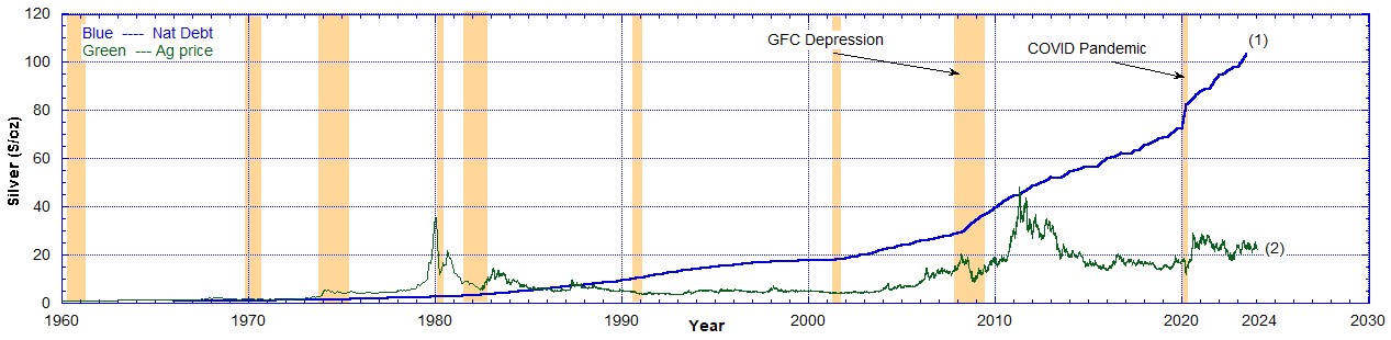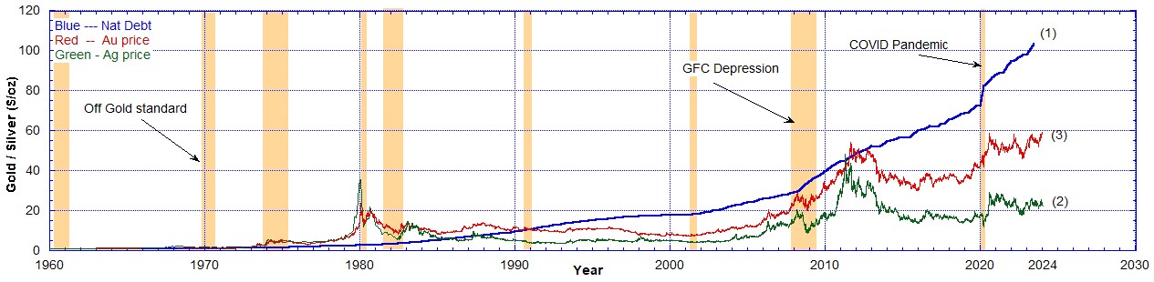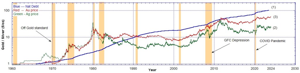 In the following charts I show the National Debt compared to the nominal historical prices of gold and silver. The National Debt has been scaled so that it may be presented on the same Chart as the precious metals’ prices.
