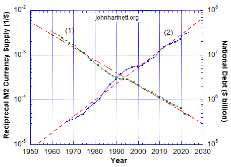 Therefore the value of the 1960’s dollars is expressed in units of 1/M2 where M2 denotes the total nominal dollars at the time of creation (curve (1)). Compare that to the US National Debt (in units of $ billions where $ denotes the nominal dollar at the time of the debt creation) (curve (2)).