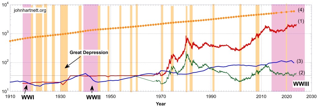 On Chart 3 I compare the production of gold against the gold price from 1915 to 2024. The red curve (1) indicates the nominal gold price which has been rising exponentially since 1971 when the exchangeability with dollars ceased. The background trend ignoring the big rallies are on an exponential trend line.