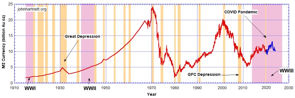 If we price the US Fed M2 currency supply in terms of oz of gold, we see something very striking. See Chart 4.