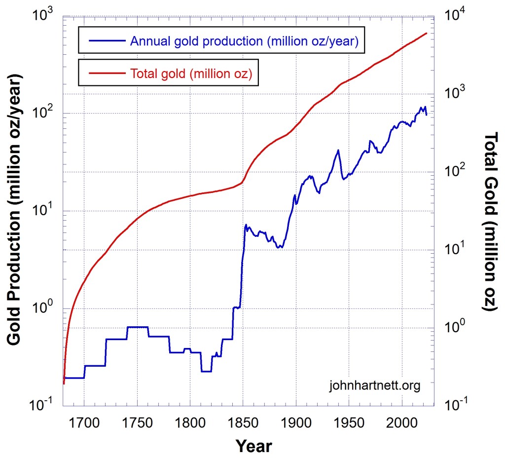 Gold has been mined continuously since those early days but as technology has improved significant efficiencies have been achieved and lower grade ore has been made profitable. After 1850 annual production started to pickup, and particularly after 1900 there has been exponential growth in production. About 86% of all above ground gold has been mined in the last 200 years.