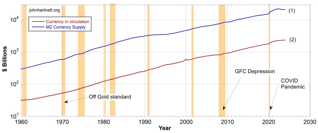 Chart 3 compares the currency in circulation (red curve (1)), the major component of the total monetary base, with the M2 money supply (blue curve (1)). The latter is 9 times the former. Both are increasing exponentially. That is a necessity in any fiat credit/debt based system.