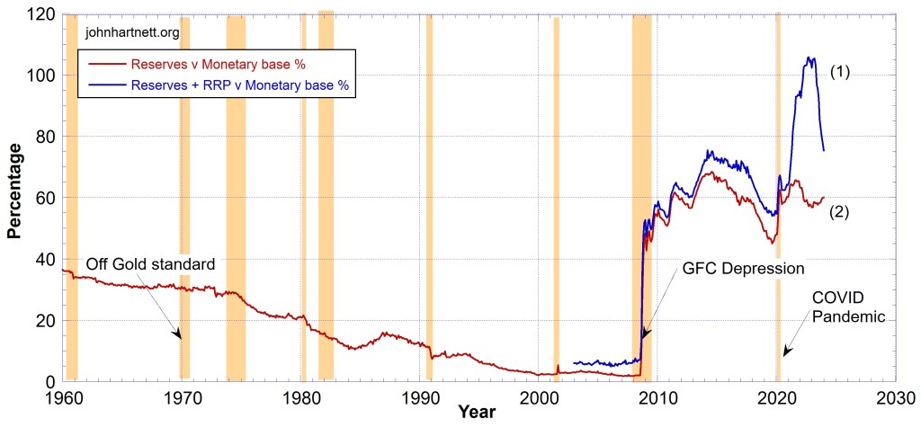 Chart 2 shows the Fed Reserve Liabilities as a percentage of it Total Monetary base (red curve (2)) as well as the percentage when the RRPs are added to the Reserves (blue curve (1)). During 2022 – 2023 this percentage rose above 100% reaching 105%. This makes it clear to see that this fiat currency is just debt. It is comprised of just IOUs. There is no real money there at all.