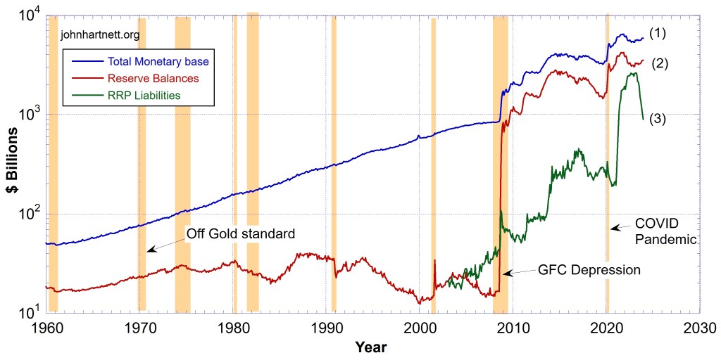 The US Total Monetary base, the Reserves held at the Federal Reserve central bank, and the Fed’s Reverse Repurchase (RRP) Agreement Liabilities are shown in Chart 1 below.