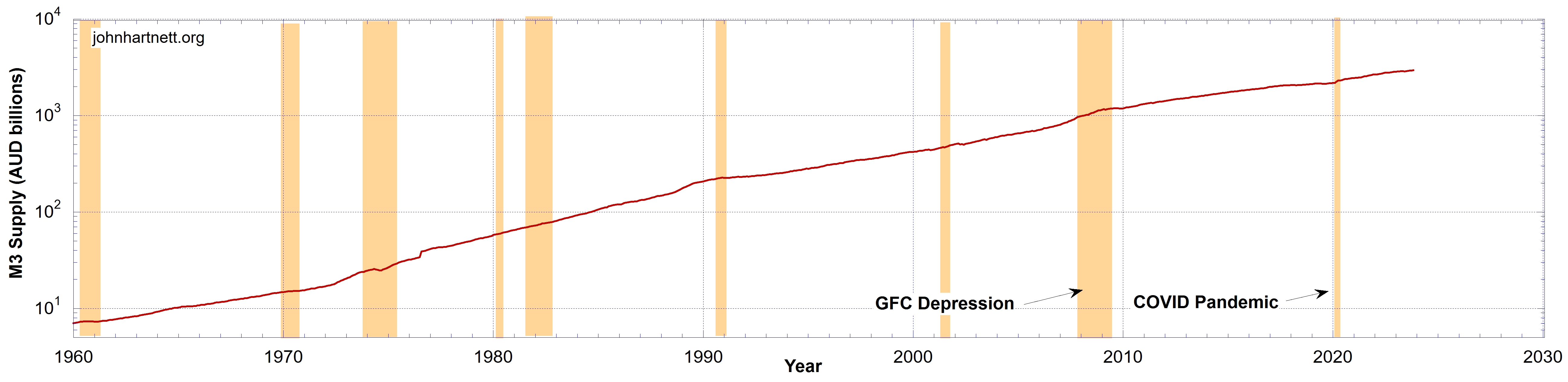 Chart 2 shows the annualised inflation rates as calculated from the Australian M3 money supply and CPI inflation as provided by the Australian Bureau of Statistics. It is quite obvious that there is a significant difference between the two statistics. Over 65 years CPI inflation has rarely been anywhere near the official government CPI inflation numbers. Surprisingly in 2023-2024 they are the same. For all other years CPI inflation is a fraud, a total fraud.