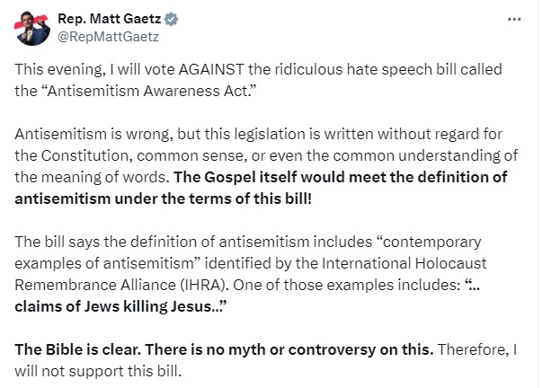 As Representative Matt Gaetz wrote on X.com it would mean the preaching of the gospel would be outlawed. Any portions of the New Testament that gives the known history of how Jesus was tried and crucified at the hands of the Jewish Sanhedrin would be made illegal.
