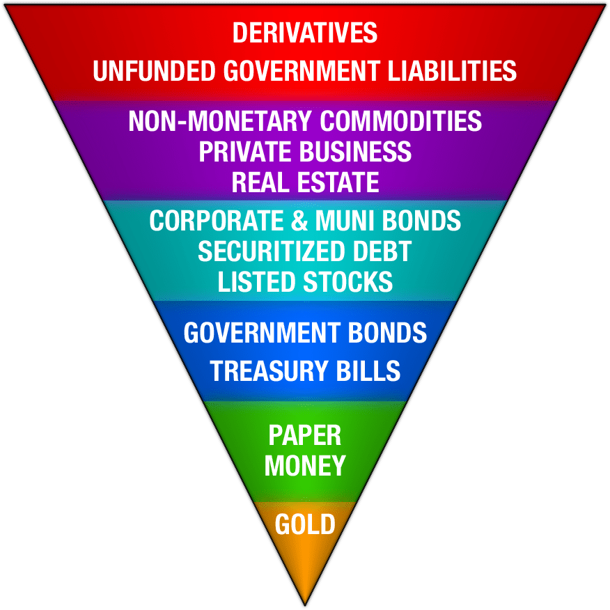 In John Exter’s inverted pyramid scheme gold forms the very small base of the most reliable value, and asset classes built progressively on higher levels are successively more risky. All layers above gold are derivatives built on the lower layer. The larger size of asset classes at higher levels is representative of the higher total worldwide notional value of those assets.