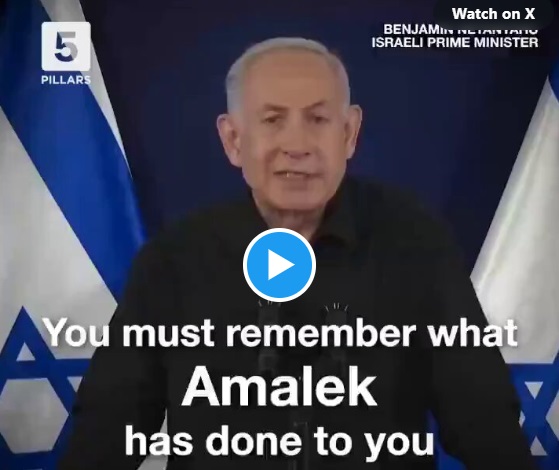 Prime Minister Benjamin Netanyahu declared genocide on Amalek like he is living 3 thousand years ago in the nation of Israel. His swords are drawn, his teeth are sharpened for genocide of Gazan Palestinians.