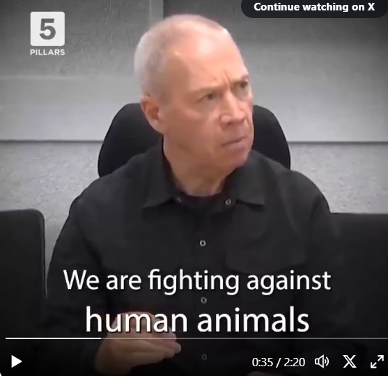 Defense minister Yoav Galant says they are fighting human animals. This is a dehumanizing technique. He also says they will turn off all water, food and aid to the Gazan population.