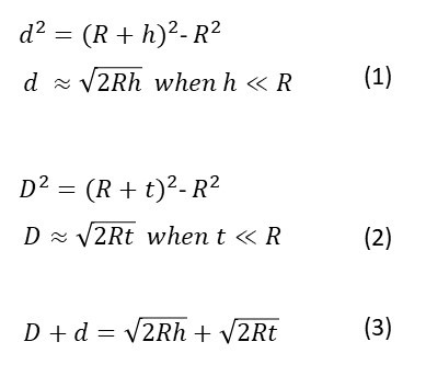 Using Fig. 1, imagine you are standing at sea level and you have a height of h (from your feet to your eyes) and you are looking across the ocean and see the point just at your horizon of a building (or ship) of height t above sea level at a distant location. The building (or ship) could be higher than t but that is its point you can just see above your horizon from where you stand. If the building (or ship) cannot be seen then it is below your horizon, as illustrated by the hull of the more distant ship in the image above.