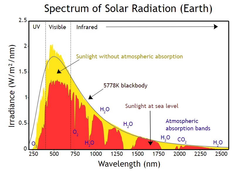 The yellow region of the plot shows what the power level would be if there was no atmospheric absorption. The red region shows the measured power in the sunlight reaching the surface after absorption by the atmosphere. Notice the absorption bands are labeled with H2O (water), CO2 (carbon dioxide), O3 (ozone) and O2 (oxygen). The depth of those bands tells you how much radiation is absorbed by those molecules, which in turn heat the atmosphere.