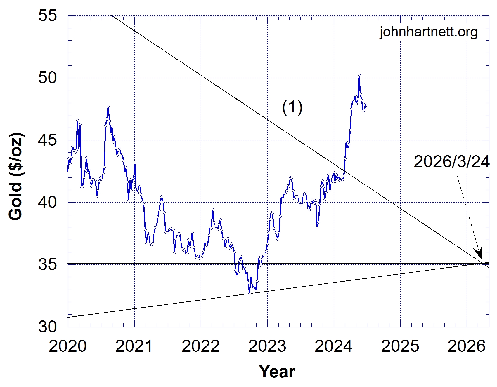 Since March 2024 the uninflated price of gold has broken out of the triangle after it crossed line (1). And it has continued to stay well above that line since.