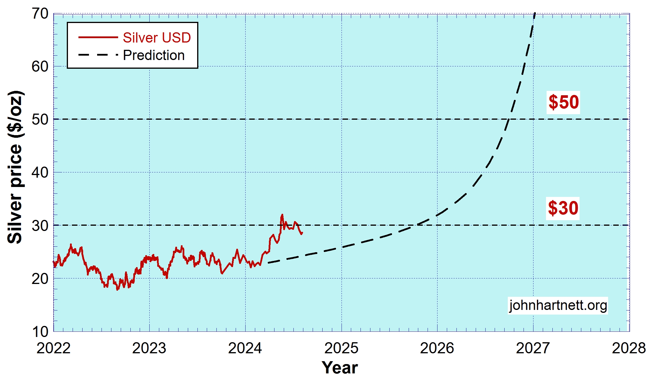 Similarly I have update the prediction for the silver price. For an introduction read Silver in the Crack-Up Boom.