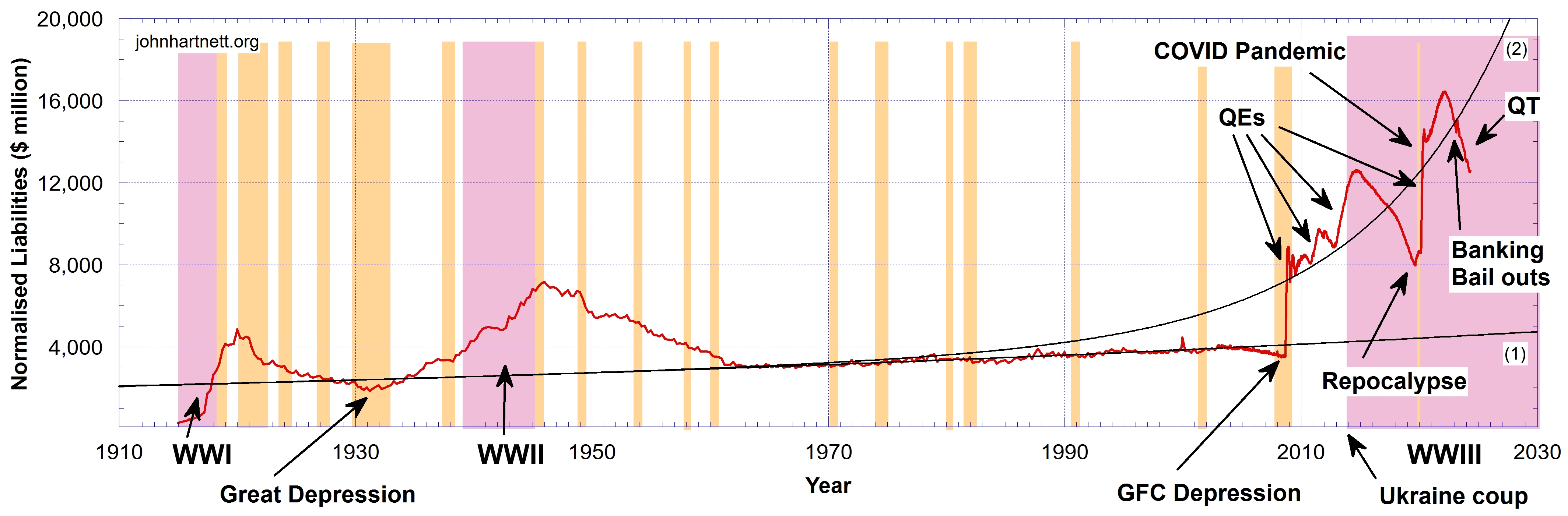 Source: Liabilities data for 1916–2024 from the Board of Governors of the Federal Reserve System, statistical release H.4.1, Factors Affecting Reserve Balances of Depository Institutions and Condition Statement of Federal Reserve Banks, via FRED; and M2 money supply data for 1959–2024 from the Board of Governors of the Federal Reserve System, statistical release H.6, Money Stock Measures, via FRED. Note: The solid trend line (1) is a curve fit to the data between 1965 and 2003. The solid trend line (2) is a double exponential curve fit to the data after 2003. The two world wars are indicated by arrows pointing to the pink regions. Recessions are indicated by sepia-colored strips. QE is Quantitative Easing (credit creation). QT is Quantitative Tightening (credit contraction).