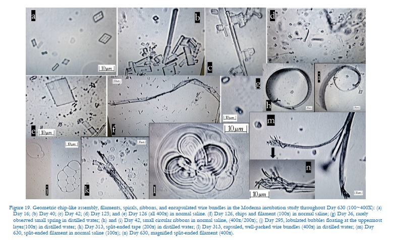 Systematic analyses of observable real-time injuries at the cellular level in recipients of the “safe and effective” COVID-19 injectables are published here in a peer-reviewed context for the first time. … The contents of COVID-19 injectables were examined under a stereomicroscope at up to 400X magnification. Carefully preserved specimens were cultured in a range of distinct media to observe immediate and long-term cause-and-effect relationships between the injectables and living cells under carefully controlled conditions. … In addition to cellular toxicity, our findings reveal numerous —on the order of 3~4 x106 per milliliter of the injectable—visible artificial self-assembling entities ranging from about 1 to 100μm, or greater, of many different shapes. There were animated worm-like entities, discs, chains, spirals, tubes, right-angle structures containing other artificial entities within them, and so forth. All these are exceedingly beyond any expected and acceptable levels of contamination of the COVID-19 injectables, and incubation studies revealed the progressive self-assembly of many artifactual structures. As time progressed during incubation, simple one-and two-dimensional structures over two or three weeks became more complex in shape and size developing into stereoscopically visible entities in three-dimensions. They resembled carbon nanotube filaments, ribbons, and tapes, some appearing as transparent, thin, flat membranes, and others as three-dimensional spirals, and beaded chains. Some of these seemed to appear and then disappear over time. Our observations suggest the presence of some kind of nanotechnology in the COVID-19 injectables.