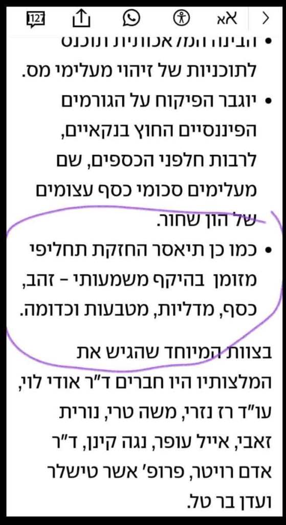 There’s some infighting going on with the Israeli deep state. Netanyahu wants to ban the 200 shekel bill and also criminalize ownership of “significant amounts” of “cash substitutes” (that’s what it says in the circle below) including gold and silver.