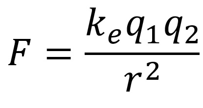 The force (F) of attraction or repulsion between two electrically charged particles (q1, q2), in addition to being directly proportional to the product of the electric charges, is inversely proportional to the square of the distance r between them; this is known as Coulomb’s law, shown below where ke is a constant.