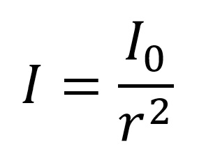The intensity (or irradiance) decreases proportionally with the square of the distance r. Or we could say the area to capture the same number of photons increases as r2. This is the well known and established law, the inverse Law of Illumination.