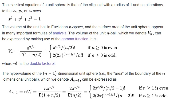 The following except from a Wikipedia article describes the mathematical properties of a sphere in a space with n dimensions.