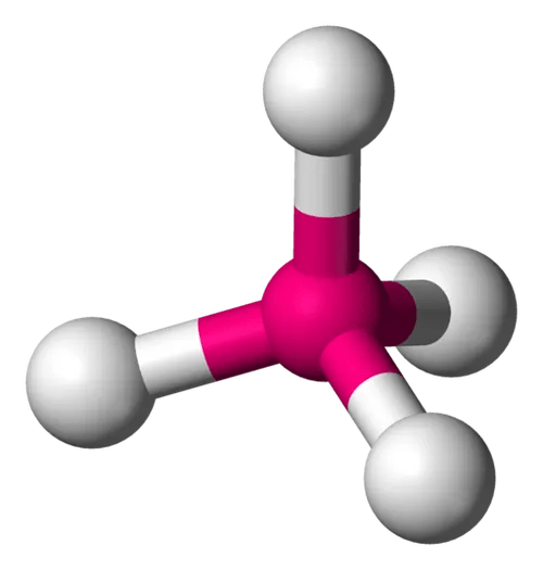 The occupation of the quantum mechanical orbitals, the regions of space where pairs of electrons spend most of their time, essentially determines the bond angles. Below a methane molecule (CH4) is illustrated, which has a central carbon atom and 4 hydrogen atoms bound equidistant in 3D space.
