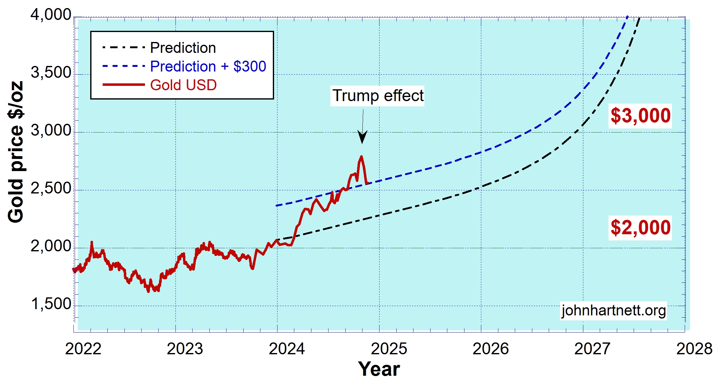 On both Charts 3 and 4 I have added a second curve (blue) which is the Prediction + $300 for the gold price and the Prediction + $5 for the silver price. These new curves align well with the current prices of gold and silver and also they show the rapid jump in prices that occurred after March 2024.