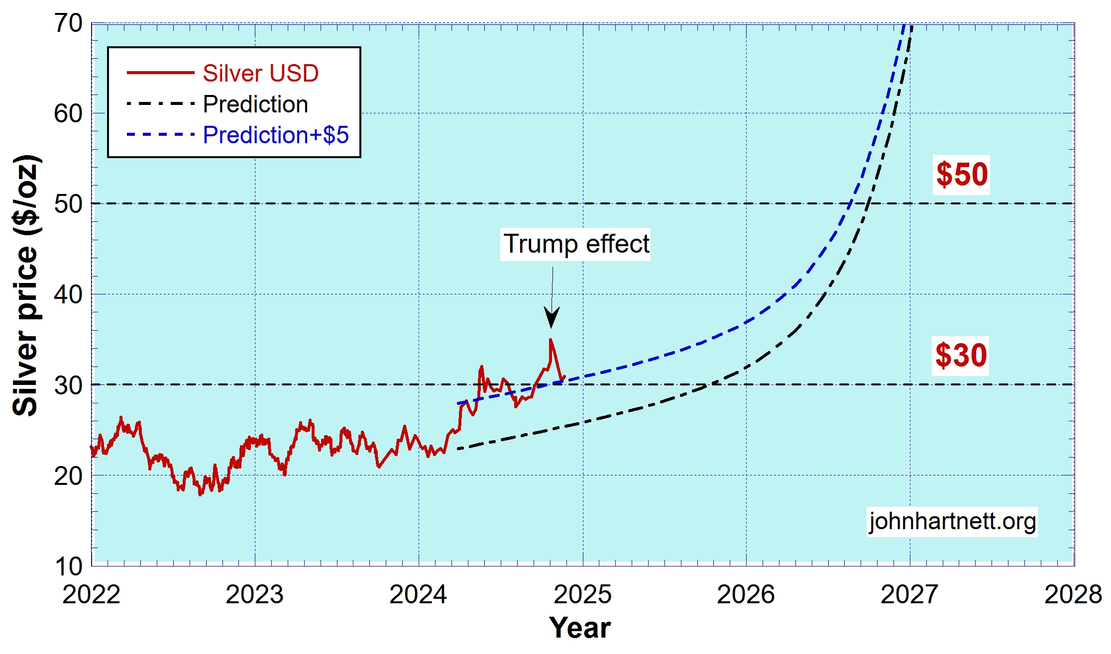 The run up to the November 5, 2024 US Presidential election saw strong price growth in both gold and silver. But after Donald J. Trump won in a landslide vote both metals prices dropped significantly in nominal terms. The peak is indicated by the label “Trump effect” on both charts. However it would now seem that that slide has finished. That is the “Trump effect” on prices has already dissipated.