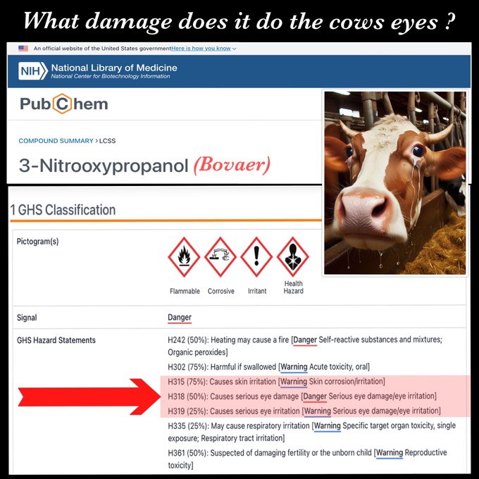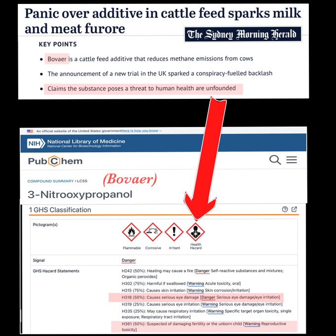 They may as well claimed it was “safe & effective” However this assertion by the SMH is in direct conflict with the listing for 3-Nitrooxypropanol (marketed under the name BOVAER)* from the US National Institutes of Health (NIH) , which using the safety & hazard warnings of the Globally Harmonized System of Classification and Labeling of Chemicals, list it as a “Health Hazard”.